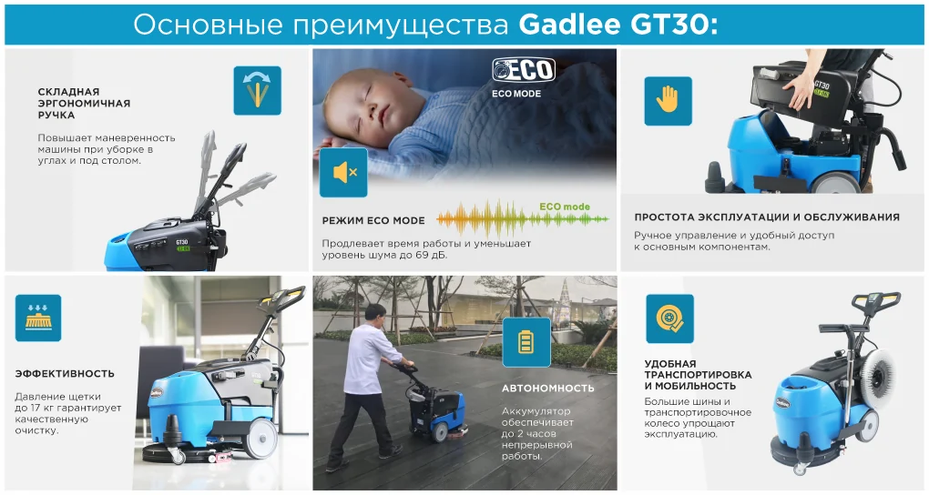 Gadlee GT30 также эффективно используется на коммерческих объектах, складских помещениях и в зонах общего доступа, где требуется регулярная очистка полов.