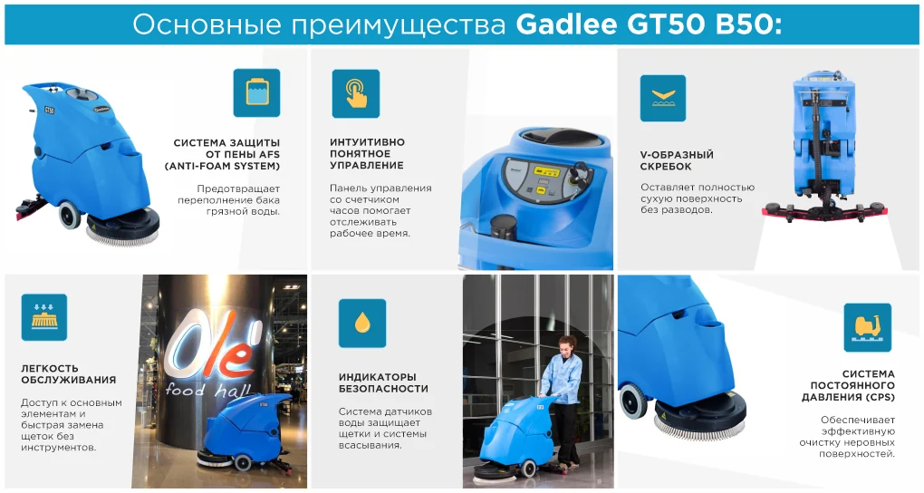 Поломоечная машина Gadlee GT50 B50 оснащена интуитивно понятной панелью управления и удобной системой обслуживания. Машина оборудована интеллектуальной системой контроля воды для защиты щетки и системы всасывания, а также V-образным скребком, который гарантирует тщательную уборку без разводов. Конструкция позволяет легко обслуживать аккумулятор и резервуар для воды, а замена щеточных дисков осуществляется без применения инструментов. Благодаря системе постоянного давления (CPS), равномерное давление поддерживается на всех типах поверхностей, включая неровные.