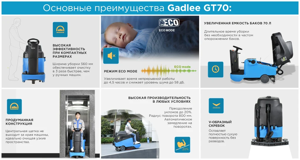 Gadlee GT70+ подходит для уборки коммерческих и общественных объектов и эффективно работает в местах с высокой интенсивностью движения и ограниченным пространством: