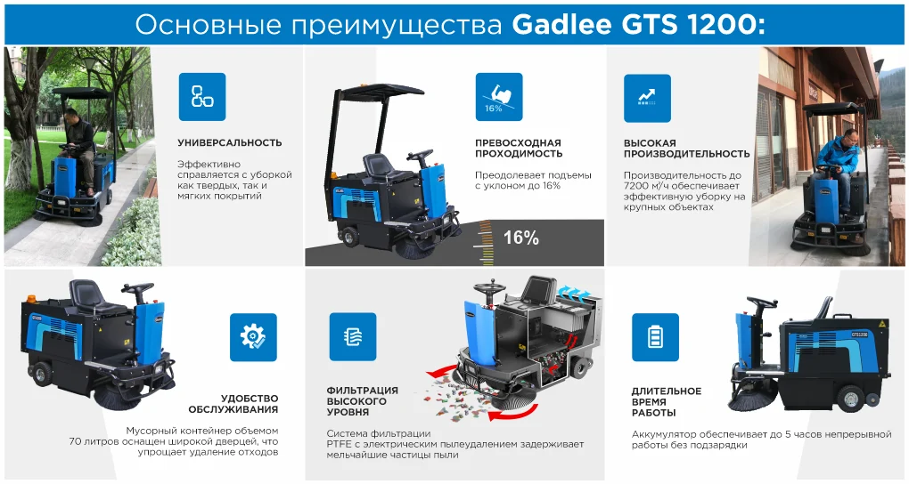 Gadlee GTS1200 — компактная, гибкая и надежная подметальная машина с местом для оператора разработана для эффективной уборки как внутри помещений, так и на открытых территориях. Прочная конструкция включает цельностальное шасси и корпус из полиэтилена высокой плотности, что обеспечивает долговечность даже при интенсивной эксплуатации. Машина оснащена усовершенствованной фильтрующей системой PTFE с площадью фильтрации 4 м2, которая увеличивает срок службы фильтра в 6 раз по сравнению с обычными системами.