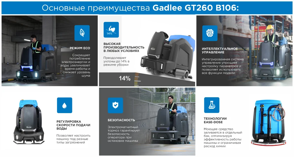 Gadlee GT260 B106 легко справляется с различными типами поверхностей. Возможность регулировки подачи воды и моющего средства позволяет экономить ресурсы, а режим ECO делает машину идеальной для использования в местах с повышенными требованиями к энергоэффективности и уровню шума.