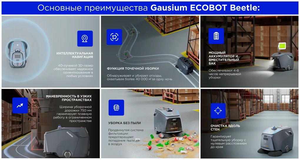 Gausium ECOBOT Beetle – мощный инструмент для поддержания чистоты на промышленных объектах, который сочетает передовые технологии, надежность и удобство использования, снижая затраты на ручной труд и повышая эффективность клининговых процессов.