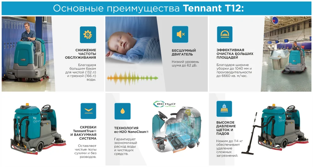 Tennant T12 — компактная поломоечная машина с местом для оператора, разработанная для больших площадей и работающая на аккумуляторной батарее. Она оснащена прочным корпусом из ударопрочного пластика и стойкими к коррозии материалами щеточной головки, что обеспечивает надежность при активной эксплуатации. Щетки специальной формы обеспечивают быстрое и качественное удаление загрязнений. Поломоечная машина оборудована эргономичным рабочим местом для оператора, а также подсветкой для эффективной уборки даже при слабом освещении.